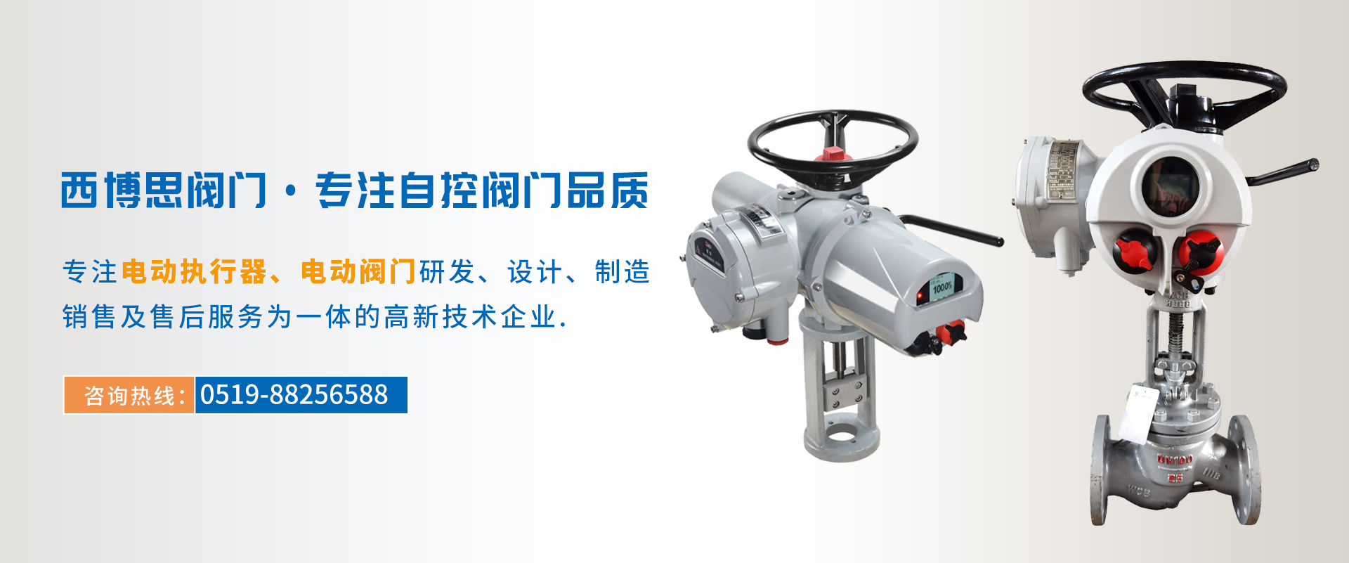 江蘇西博思閥門(mén)科技有限公司是一家專(zhuān)業(yè)從事各類(lèi)電動(dòng)執(zhí)行器,電動(dòng)閥門(mén)集研發(fā)、生產(chǎn)、銷(xiāo)售、服務(wù)于一體的技術(shù)型企業(yè)。產(chǎn)品功能齊全、性能可靠、控制系統(tǒng)先進(jìn)、使用維護(hù)方便,被廣泛應(yīng)用于電力、冶金、石油、煤炭、化工、造紙、自來(lái)水、污水處理、 物聯(lián)網(wǎng)農(nóng)田灌溉等。產(chǎn)品質(zhì)量穩(wěn)定可靠,受到廣大用戶(hù)的普遍贊譽(yù)。